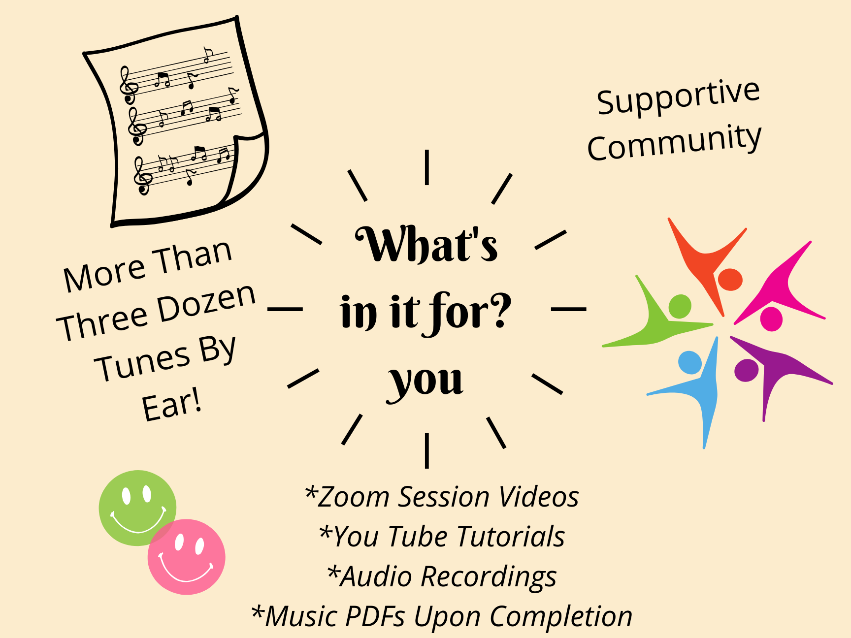 *Note: Playing by ear takes some time to develop. You will not develop this skill in one lesson! You need to be patient and give yourself time to understand the process. This course will guide and support you along this journey in a safe community of sharing and caring.