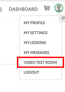 To test ahead of time log into your Lessonface account in your tablet browser, and go to the menu at the top right hand side of the page - shown below - to join your Video Test Room. Here's also a direct link: Lessonface.com/VideoTestRoom